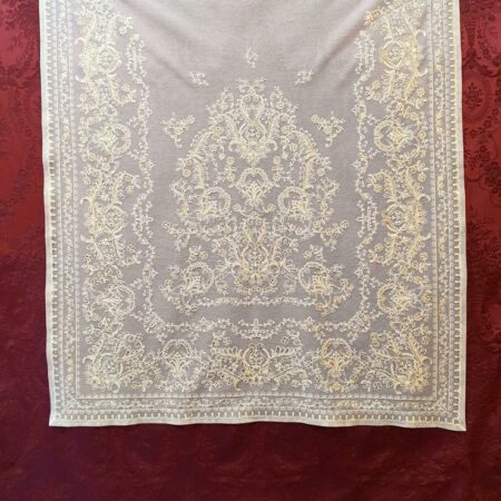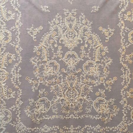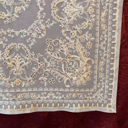 Juego de manteletas bordadas en marfil sobre tul de algodón y lentejuela oro, rematadas con orilla doblada.
