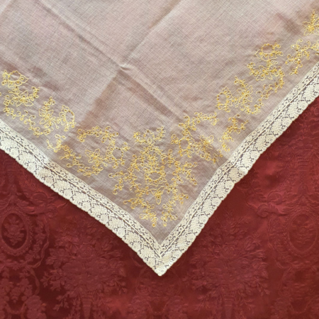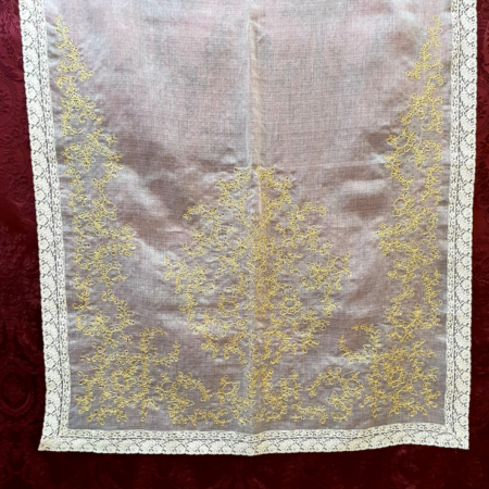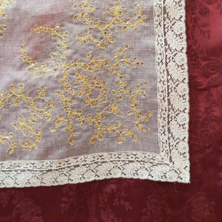 Juego de manteletas bordadas en cadeneta artesanal en oro sobre muselina rematadas con puntillas de allençon y lentejuela oro.