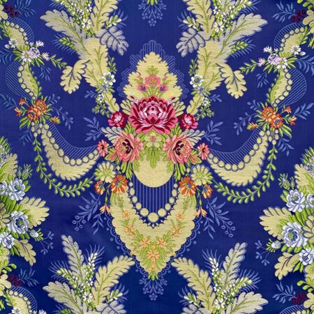 Elegante y conocido Brocatel de nombre Reina tejido con 16 hilos de trama diferentes siendo su urdimbre de Rayón. El ancho del tejido es de 64cm y su largo de 12m. Siendo el raport del dibujo de 64X53cm.
